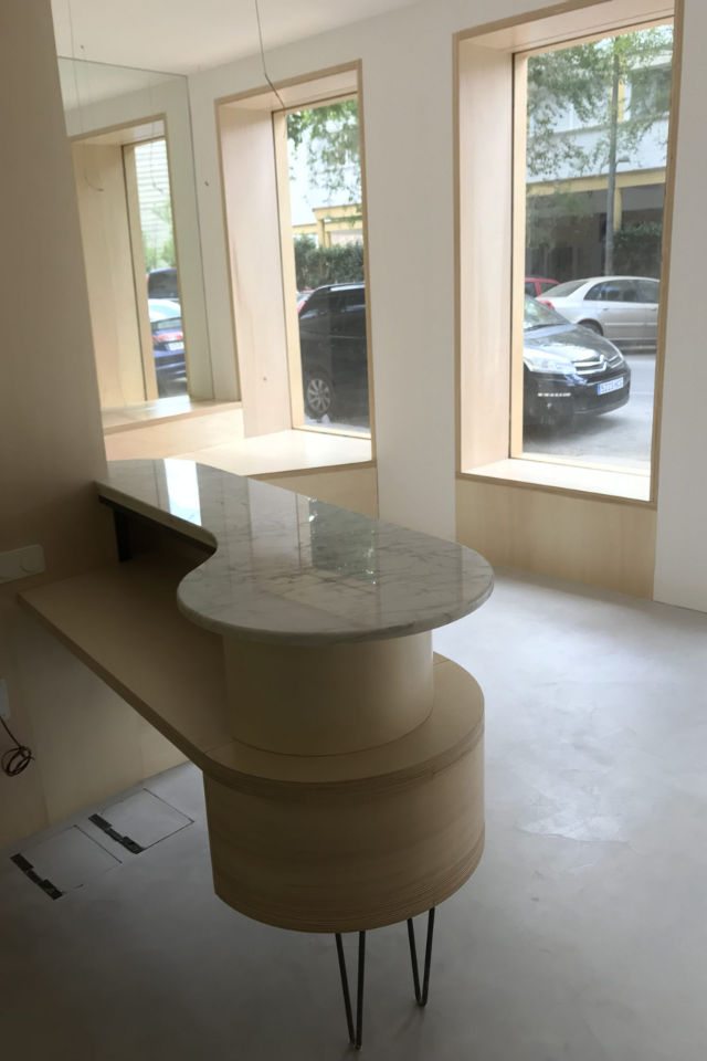 En este proyecto diseñamos y materializamos el nuevo mostrador atención al público y las estanterías, se revistieron paredes y techos, se construyeron puertas pivotantes de suelo a techo, se cuidaron al máximo todos los detalles, fabricando hasta los casquillos de madera para la iluminación y rejillas de ventilación.
