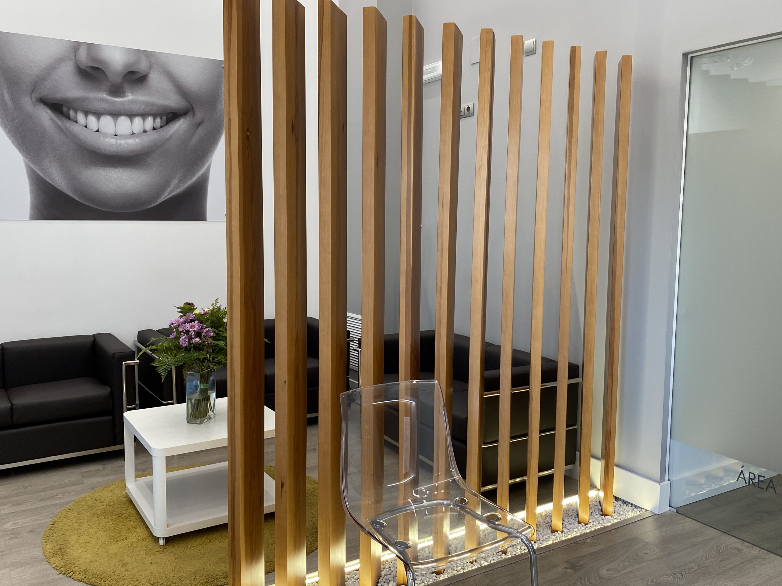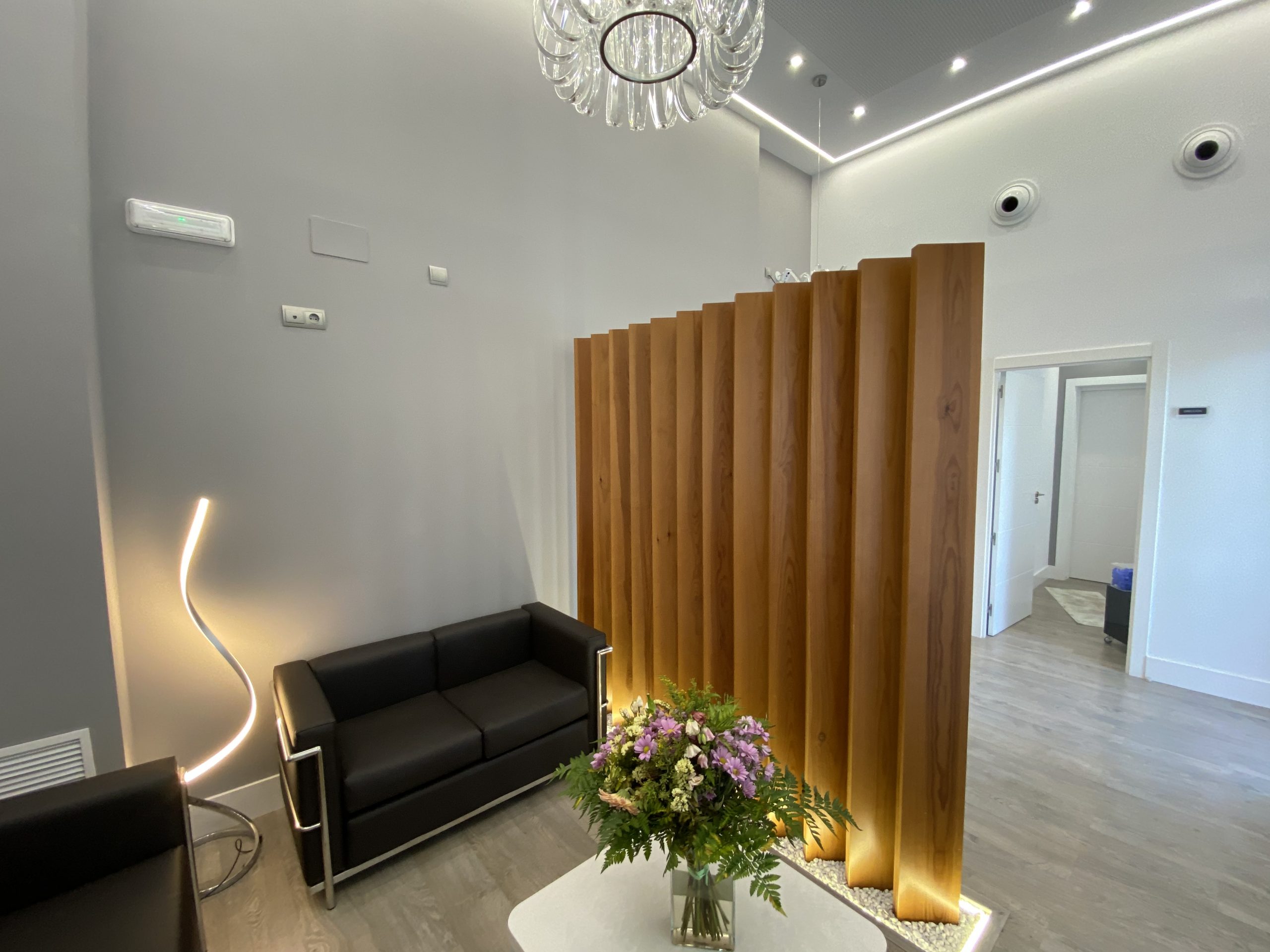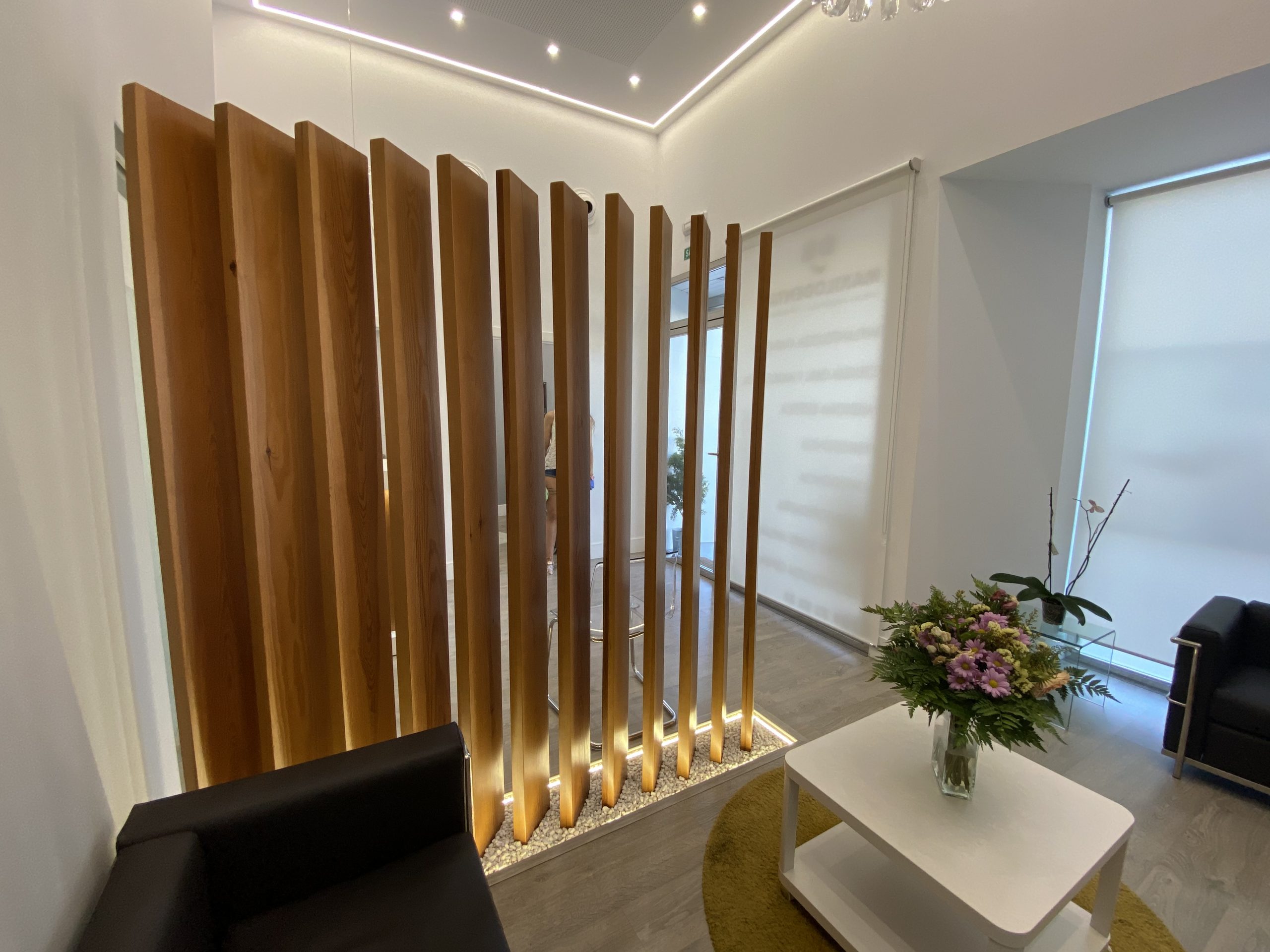 Para este proyecto hemos fabricado los escritorios de los diferentes despachos, un stand de bienvenida y un separador de espacios para la sala de espera. Todo el conjunto de mobiliario ha sido fabricado en madera MDF y madera de pino barnizada.